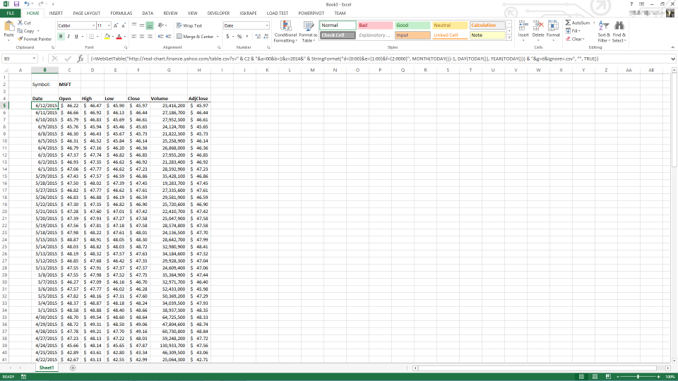 Back in Excel, we've added a parameter for our "mini-application": the stock symbol of interest. Now we can use one of the xSkrape functions to actually pull our data, parameterized using an Excel cell reference (in this case, C2). We also build a query string date reference based on "TODAY" in order to get the most current data whenever the worksheet is recalculated.